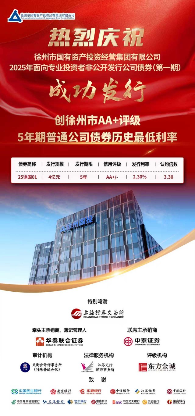 2025年10月31日,徐州國(guó)投集團(tuán)成功發(fā)行面向?qū)I(yè)投資者非公開(kāi)發(fā)行公司債券(第一期),發(fā)行利率2.30%,創(chuàng)下徐州市AA+評(píng)級(jí)5年期普通公司債券歷史最低發(fā)行利率紀(jì)錄。
