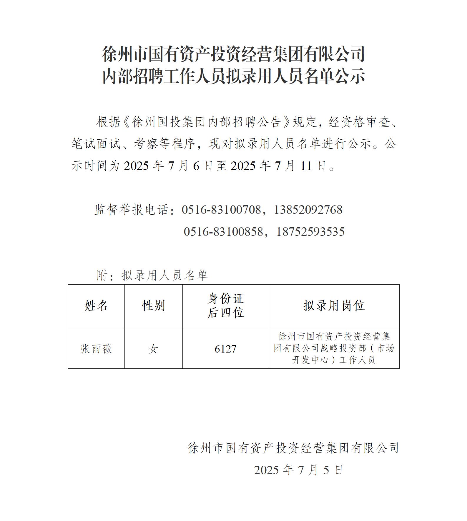 徐州國投集團內部招聘工作人員擬錄用人員名單公示