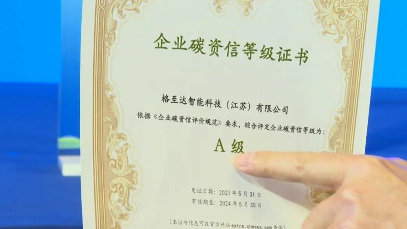 12月8日,在江蘇省新型能源體系示范啟動(dòng)暨徐州市綠色低碳能源產(chǎn)業(yè)發(fā)展推進(jìn)大會(huì)上,江蘇銀行徐州分行、格雷博智能動(dòng)力、徐州國投集團(tuán)共同簽署了格至達(dá)綠色貸款項(xiàng)目,簽署完走下臺(tái)的格至達(dá)智能科技(江蘇)有限公司副總經(jīng)理鄧昇,迫不及待地向記者展示了全市首張企業(yè)碳資信等級證書,“0001A”號!