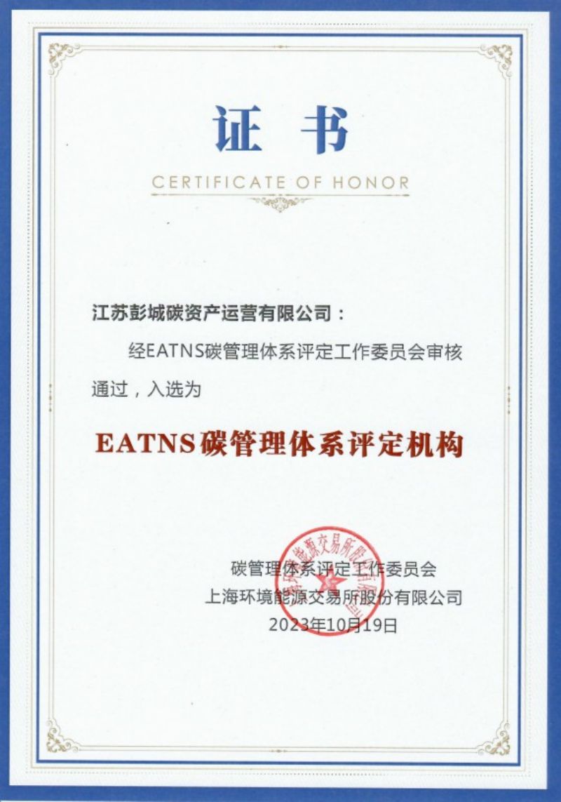 今年10月,江蘇彭城碳資產(chǎn)運(yùn)營有限公司經(jīng)EATNS碳管理體系評定工作委員會(huì)審核通過,入選EATNS碳管理體系評定機(jī)構(gòu),這是全國能開展碳資信評價(jià)的九家團(tuán)隊(duì)之一。