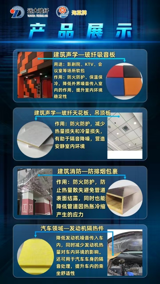 玻璃棉、玻璃棉板、玻璃棉卷氈、高溫玻璃棉卷氈、帶鋁箔玻璃棉板、帶鋁箔玻璃棉卷氈、汽車內(nèi)飾專用玻璃棉、樓地面隔聲板、無甲醛棕色玻璃棉(板)、無甲醛白色玻璃棉(板)、防排煙道專用包裹材料等、防排煙風管、玻璃棉管殼。
